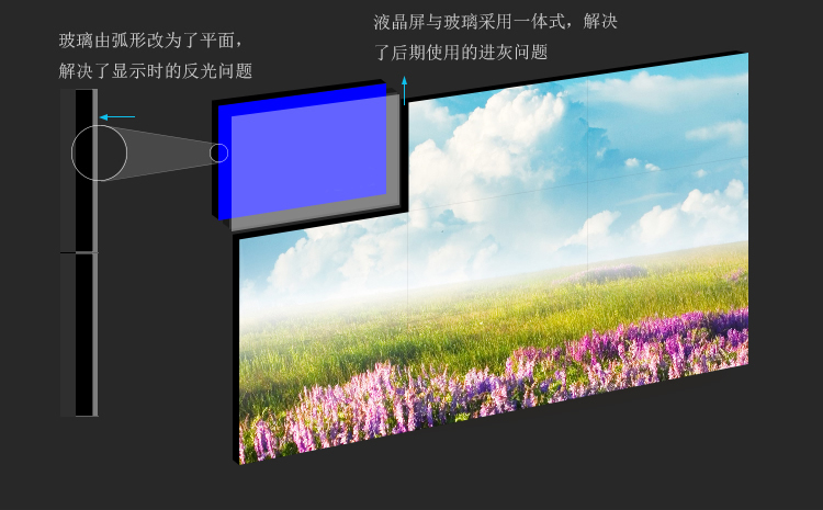 一、液晶屏與玻璃設(shè)計(jì)成一個(gè)整體,改變了原有的分體式安裝,解決了液晶屏與玻璃之間容易進(jìn)灰的問題,不僅減少后期維護(hù)成本,而且顯示效果更佳。