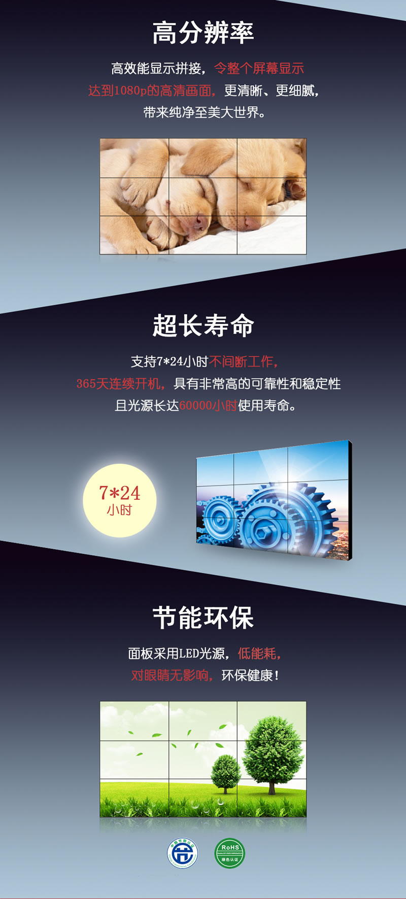 超窄邊設(shè)計(jì),雙邊拼縫僅3.5mm;采用三星原裝A+面板,運(yùn)行穩(wěn)定,支持24x7小時(shí)、365天不斷間的連續(xù)工作模式;