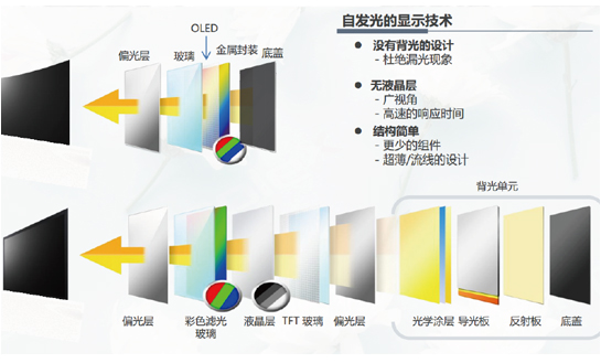 OLED是自發(fā)光技術(shù),沒有漏光現(xiàn)象,無液晶層,其視角更寬,響應(yīng)時(shí)間快,結(jié)構(gòu)簡(jiǎn)單,超薄設(shè)計(jì),屏體厚度只有3mm左右;