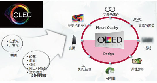 自發(fā)光、廣色域、輕薄、曲面、彈性、可彎曲、透明;